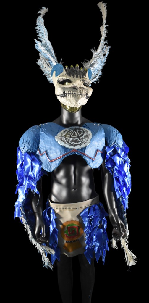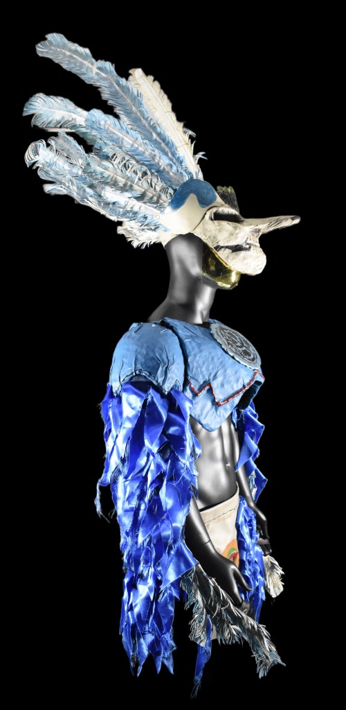 Visto por primera vez en «Obsidiana» (01. Al Cantar el Colibrí, 19 de mayo de 2022), surge un símbolo de guerra y resistencia; una armadura moderna tejida con la herencia ancestral de los pueblos de Aztlán. Se trata de un artefacto ceremonial y bélico, una armadura de combate adornada con plumas de colibrí y coronada por un imponente copilli de obsidiana recubierto en acero, moldeado con la forma de un cráneo de un colibrí. Flanquean el copilli plumas azules, símbolo del cielo y del agua, y al centro del pecho resplandece el emblema del Nahui Ollin, envuelto por una serpiente de obsidiana; forjado por El Alicante y el pueblo ancestral de Aztlán como tributo a DrAgonfire Alex, quien los guio bajo la figura de Huitzilopochtli.