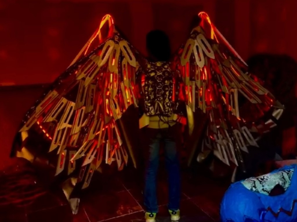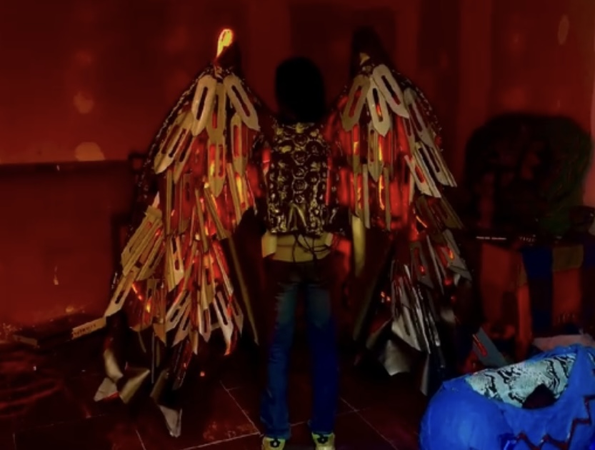 Esta armadura es complementada en la modernidad con un par de alas mecánicas plateadas segmentadas con cuchillas de acero inoxidable, impulsadas por magma líquido. Aunque aún en desarrollo, representan un avance crucial. DrAgonfire Alex comienza la construcción de estas alas inspirado por códices mexicas antiguos, reestructurados a través de hologramas 3D. Fusiona así la majestuosidad del águila real con la velocidad indomable del colibrí, aplicando los principios de matemáticas y física maya futurista que él mismo desarrolló. Este diseño se revela por primera vez su proceso de creación en el promocional de Al Cantar el Colibrí, el 24 de abril de 2022.